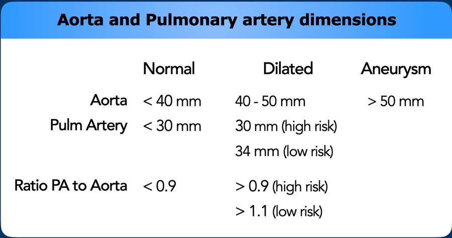 Trong dân số chung với nguy cơ thấp mắc tăng áp động mạch phổi, đường kính động mạch phổi chính > 34 mm, hoặc tỷ lệ MPA/Động mạch chủ > 1,1, cần được ghi nhận là giãn.