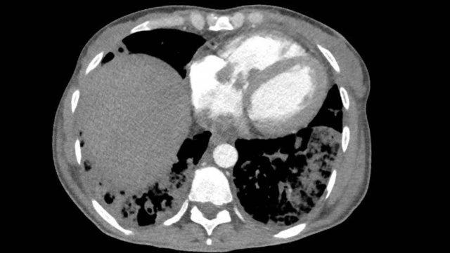 Cấp máu động mạch hệ thống bất thường phát hiện tình cờ của phân thùy sau-đáy bình thường thuộc thùy dưới phổi phải, không có phổi biệt lập. Lưu ý các dấu hiệu ứ huyết kín đáo tại phân thùy liên quan của thùy dưới phổi phải.