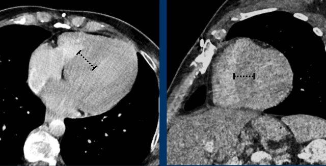 Nhĩ phải thường giãn do bệnh lý van ba lá, có thể là nguyên phát hoặc thứ phát do bệnh lý thất phải. Thất phải có thể bị giãn vì nhiều nguyên nhân khác nhau, trong bối cảnh cấp tính hoặc mạn tính hơn.
