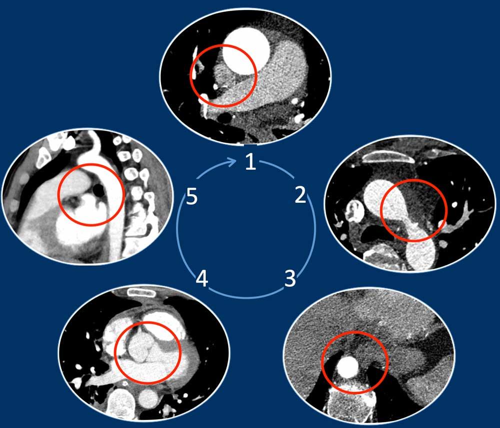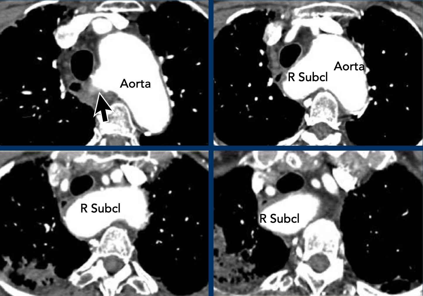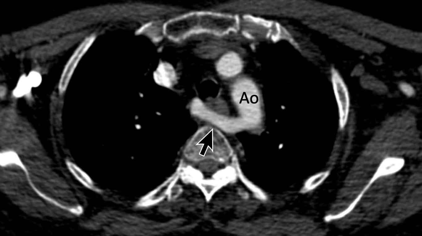 Các mạch máu cung động mạch chủ có thể được đánh giá dễ dàng về tình trạng tắc nghẽn đoạn gần trên CT có tiêm thuốc cản quang.
