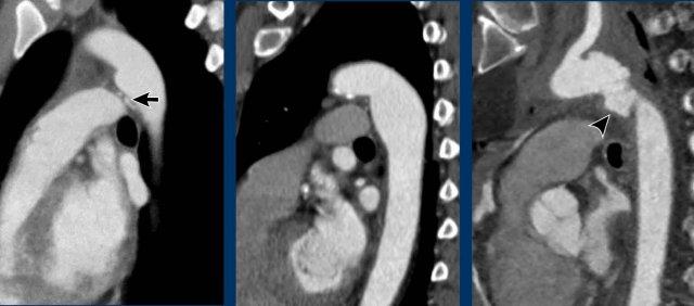 Các ví dụ về túi thừa động mạch chủ (trái), hình thoi động mạch chủ (giữa), và tổn thương động mạch chủ do chấn thương tại mức eo động mạch chủ.