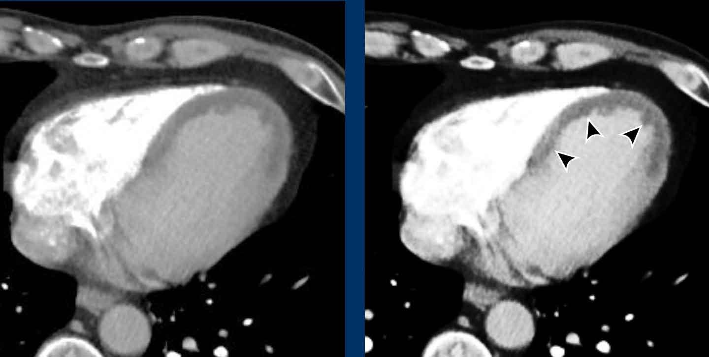 Trong giai đoạn cấp tính của nhồi máu cơ tim, khiếm khuyết tưới máu có thể được phát hiện trên CT ngực có thuốc cản quang dưới dạng vùng giảm tỷ trọng trong lãnh thổ tưới máu của một động mạch vành.