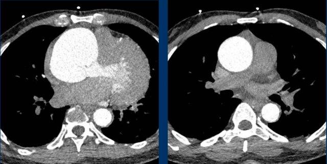 Huyết khối bám thành trung tâm ở bệnh nhân bị bệnh huyết khối tắc mạch mạn tính kèm giãn buồng tim phải, phù hợp với tăng áp động mạch phổi do huyết khối tắc mạch mạn tính (CTEPH).
