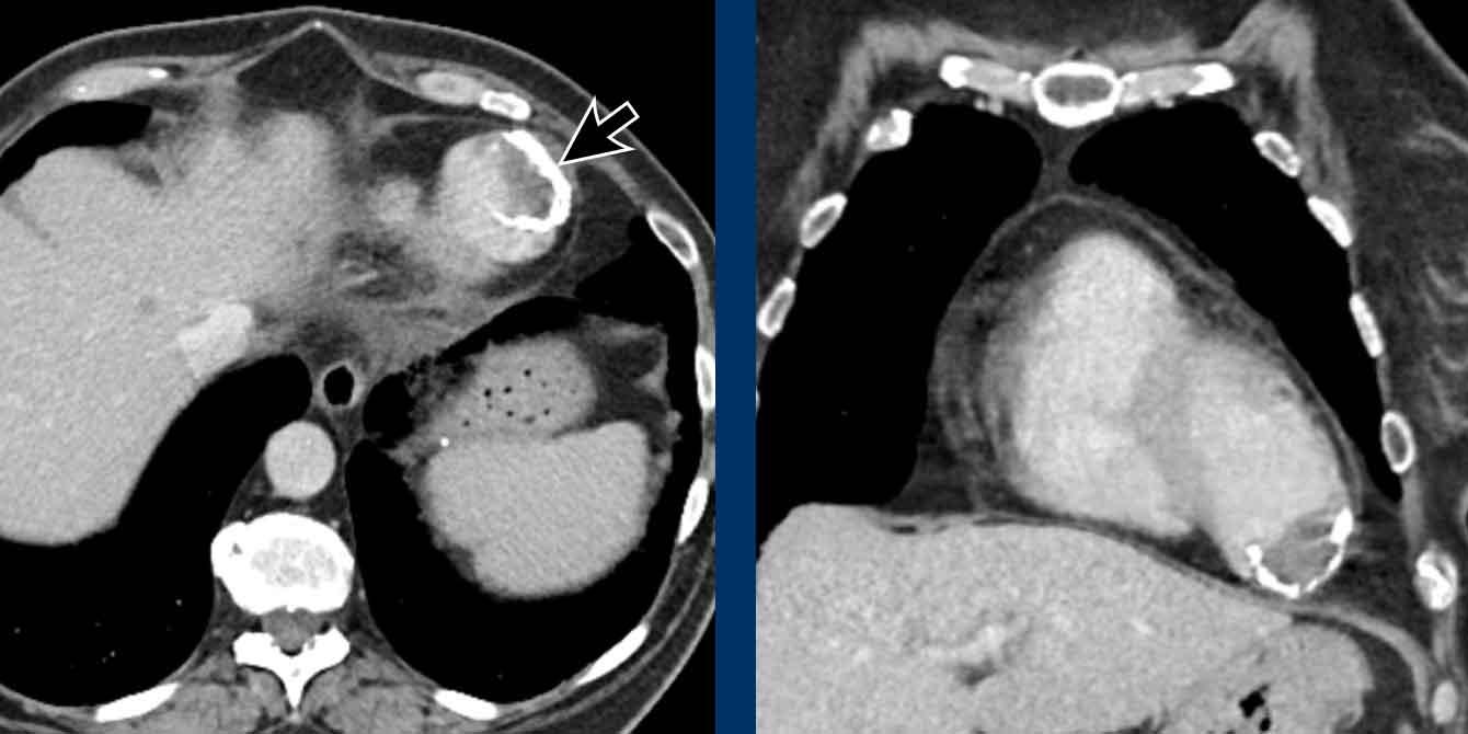 Giãn phình tâm thất trái có thể hình thành sau nhồi máu cơ tim, và đôi khi có hình ảnh vôi hóa thành.