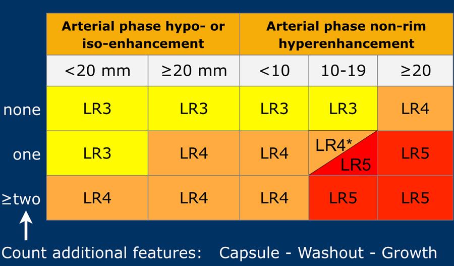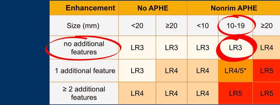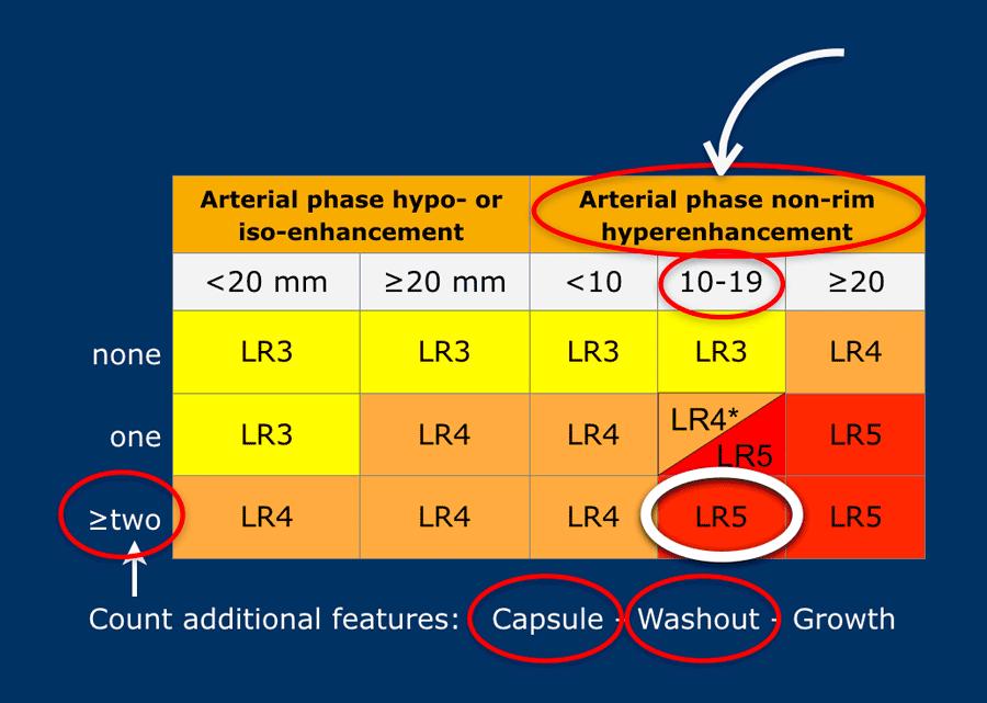 Phần quan trọng nhất của bảng là khi chúng ta phải quyết định xếp một tổn thương vào phân loại LR-3 (xác suất trung gian), LR-4 (nhiều khả năng là HCC) hay LR-5 (chắc chắn là HCC).