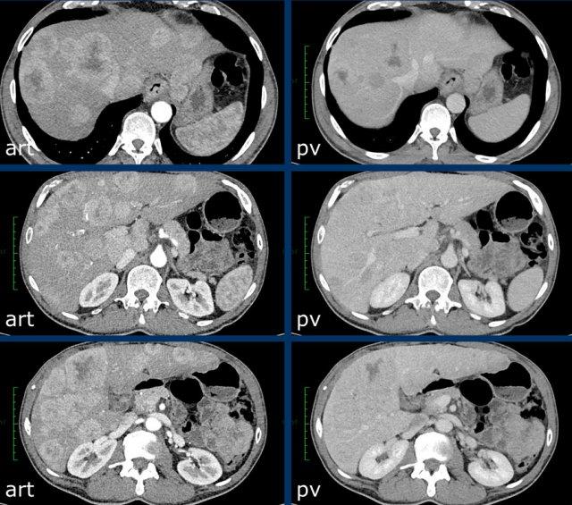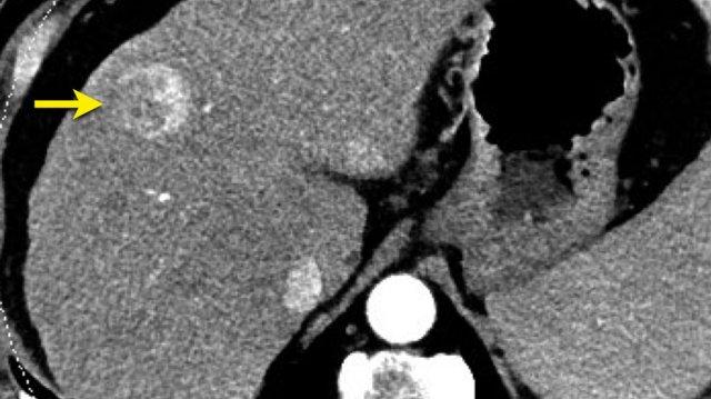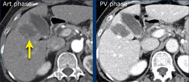 Một số tổn thương giảm tỷ trọng nhẹ so với nhu mô gan lân cận ở thì cửa, và các tổn thương lớn hơn có trung tâm hoại tử.
