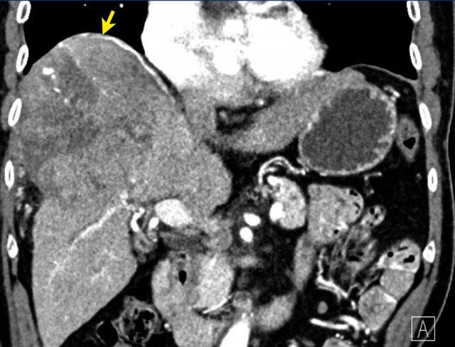 Hình ảnh mặt phẳng coronal cho thấy một tổn thương lớn đã được điều trị bằng TACE với các vùng ngấm thuốc thì động mạch nhẹ và thải thuốc còn sót lại do nguồn cấp máu chưa được điều trị qua động mạch hoành (mũi tên vàng): LRTR còn khả năng sống.