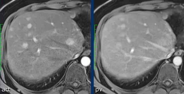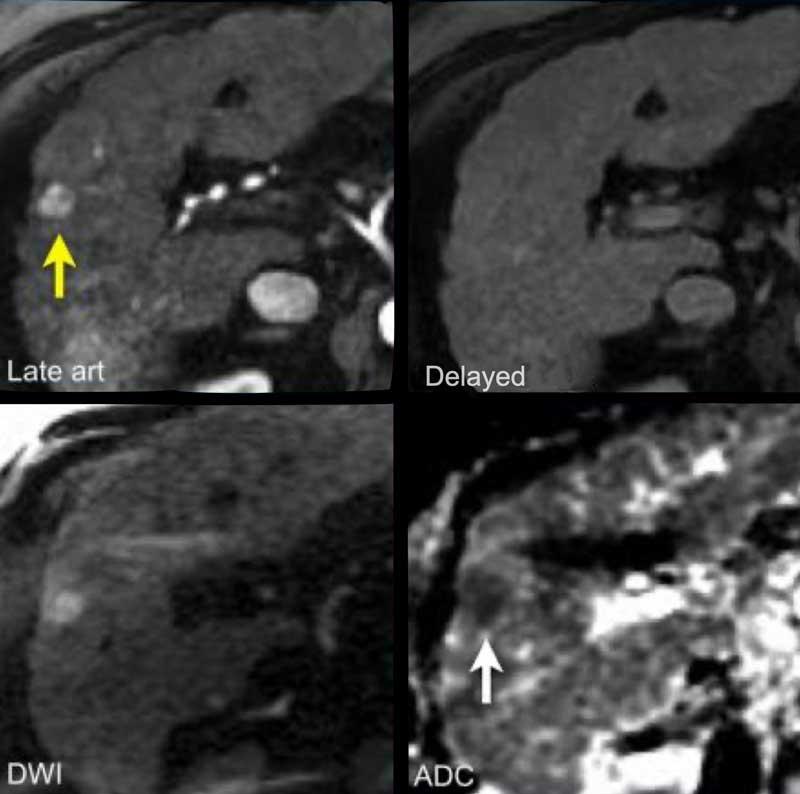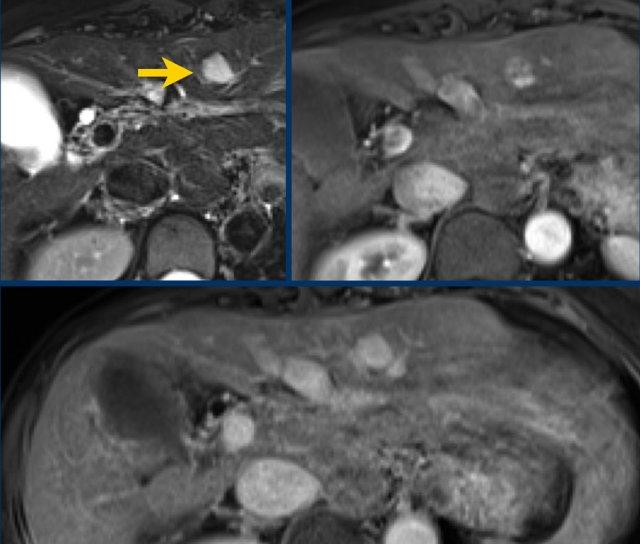 Trên bệnh nhân xơ gan này, các hình ảnh MRI cho thấy một tổn thương ngấm thuốc thì động mạch (< 2 cm) ở thùy gan phải (mũi tên).