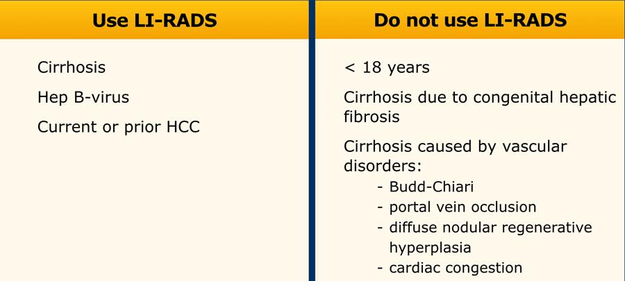 LI-RADS không được áp dụng cho bệnh nhân dưới 18 tuổi hoặc bệnh nhân xơ gan do xơ hóa gan bẩm sinh hay do các rối loạn mạch máu, vì những bệnh nhân này có nguy cơ phát triển HCC thấp hơn.