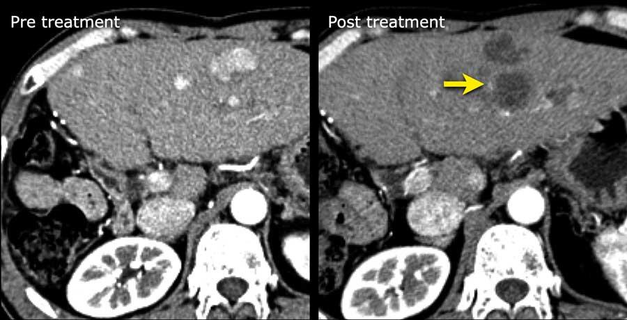 Các thay đổi tưới máu nhu mô gan liên quan đến điều trị có thể bắt chước hoặc che khuất khối u còn sót lại, dẫn đến đánh giá dương tính giả hoặc âm tính giả về khả năng sống của khối u.