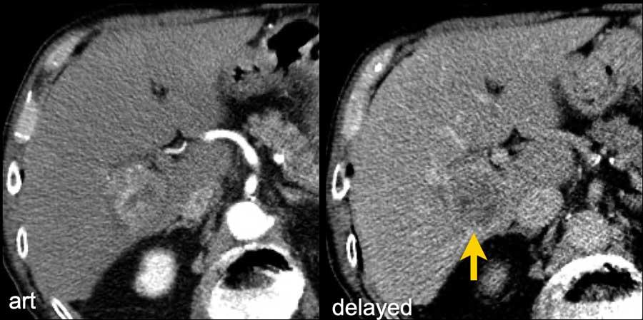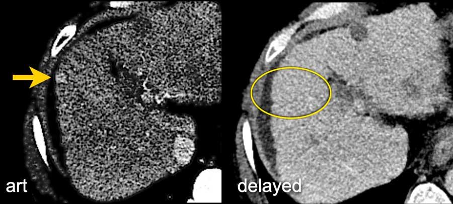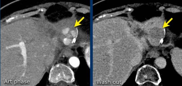 Lưu ý hình ảnh ngấm thuốc kém của nhu mô gan và tĩnh mạch cửa (mũi tên trắng) trong thì động mạch sớm, và ngấm thuốc tốt của cả động mạch gan (mũi tên trắng) lẫn tĩnh mạch cửa (mũi tên xanh) trong thì động mạch muộn.