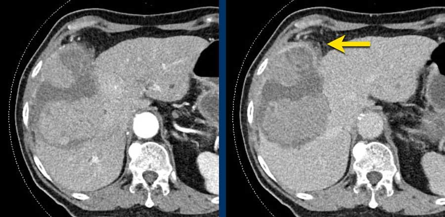 TRÁI: Tổn thương tăng ngấm thuốc phát hiện tại phân thùy 5. PHẢI: Theo dõi sau 3 tháng cho thấy tổn thương tăng kích thước.