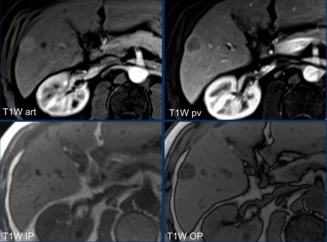 Ví dụ bao gồm các nốt tăng tín hiệu trên T1W, giảm tín hiệu trên T2W, nốt chứa sắt (siderotic) hoặc tăng tín hiệu trên thì gan mật (hepatobiliary phase).