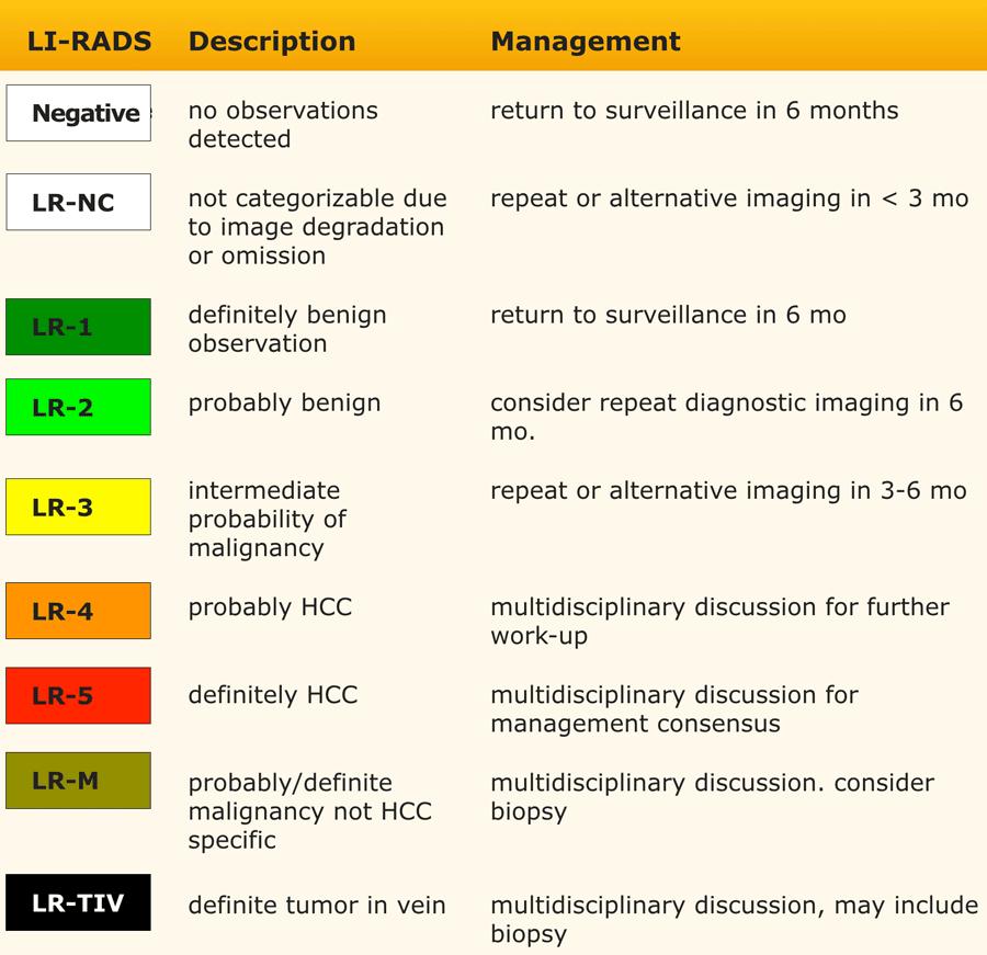 Các phân loại LI-RADS phản ánh xác suất một quan sát là HCC, dao động từ LR-1 (chắc chắn lành tính) đến LR-5 (chắc chắn là HCC).