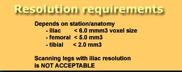 Không sử dụng cùng một vùng chụp cho mỗi vị trí, mà cần điều chỉnh kích thước và góc nghiêng của các vùng chụp ở mức chậu, đùi và cẳng chân. Đặc biệt ở mức đùi, một vùng chụp nhỏ thường là đủ. Điều này tiết kiệm thời gian và cho phép chuyển nhanh sang chụp cẳng chân.