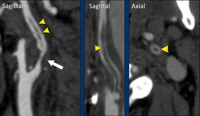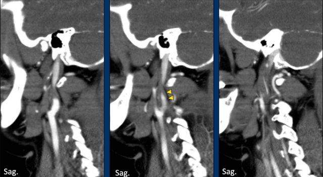 Trên mặt phẳng cắt dọc, có thể thấy một khiếm khuyết ngấm thuốc dạng dải dọc tại đoạn gần của động mạch cảnh trong (đầu mũi tên).