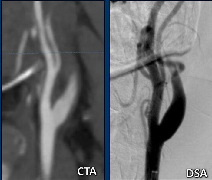 Trong một nghiên cứu so sánh các dấu hiệu trên CTA với DSA xóa nền (tiêu chuẩn vàng cho các tổn thương động mạch cảnh), kết quả cho thấy độ chính xác cao trong chẩn đoán tắc xơ vữa và hẹp mức độ cao của động mạch cảnh trong.