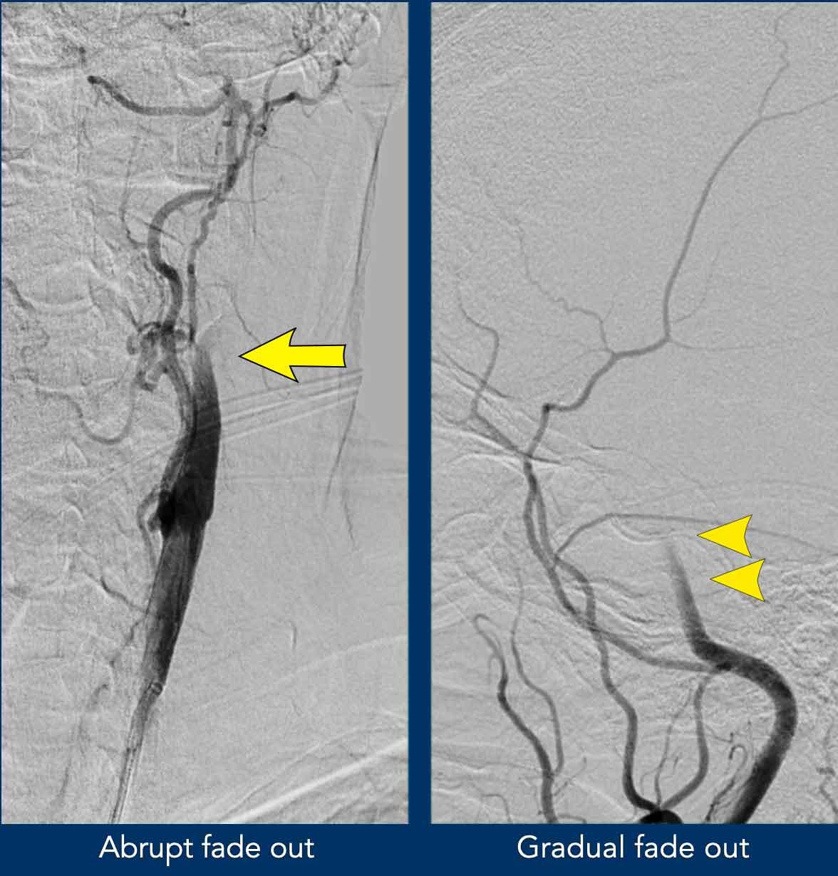 Ở bệnh nhân này trong quá trình chụp mạch qua ống thông, ban đầu xuất hiện hình ảnh loang màu nước điển hình của thuốc cản quang trong ICA, mô phỏng hình ảnh tắc nghẽn gần của ICA.