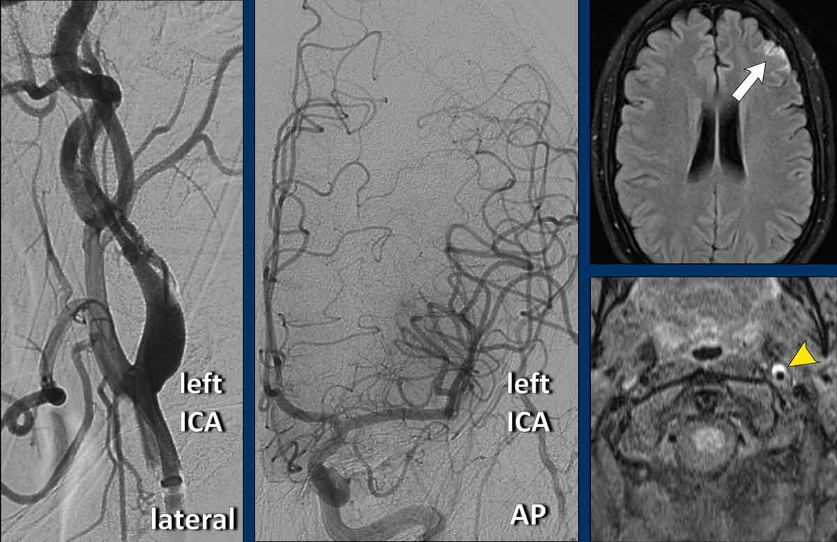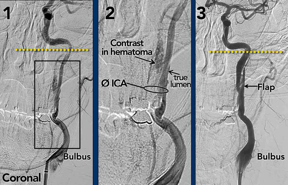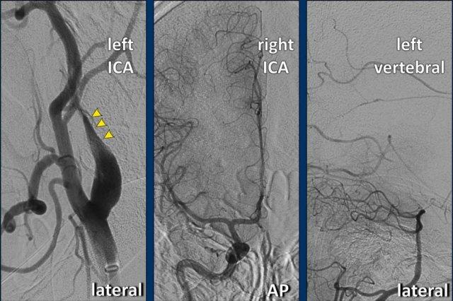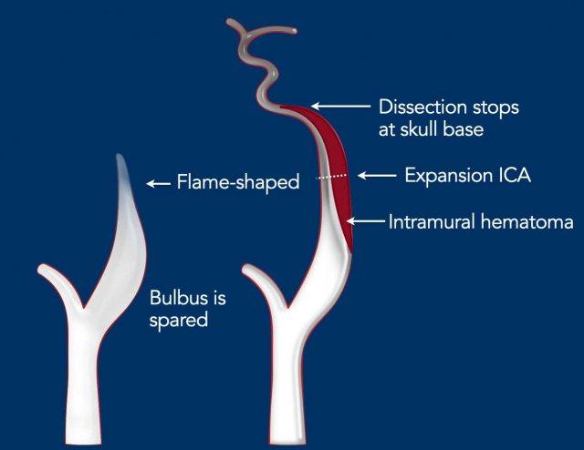 Sự kết hợp giữa hình ảnh tắc nghẽn trong một ICA bị giãn và phình to cho thấy chúng ta đang đối mặt với một trường hợp bóc tách mạch máu.