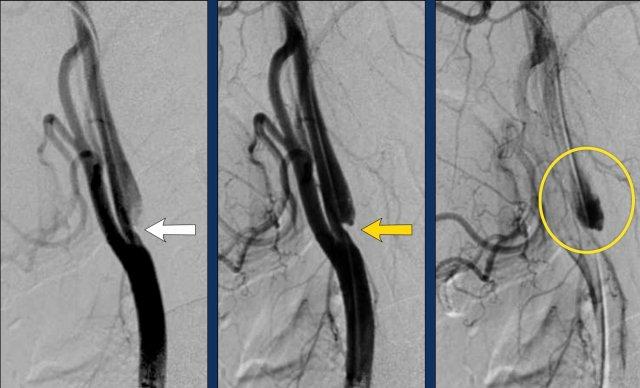 Trên các hình ảnh chụp mạch đầu tiên, bạn có thể nhầm với hình ảnh hẹp lòng mạch (mũi tên trắng ảnh bên trái).