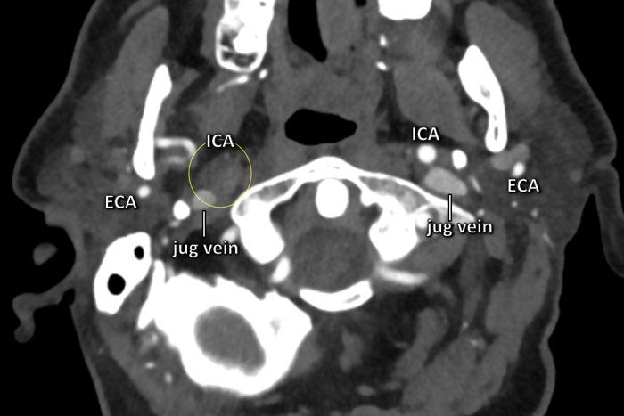 Ở bên trái, ICA và ECA có hình ảnh bình thường (cấu trúc tăng tỷ trọng nằm giữa hai mạch là mỏm trâm).