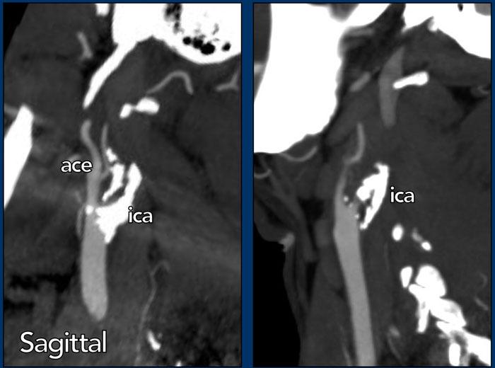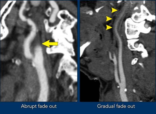 Các hình ảnh này cho thấy hình ảnh điển hình dạng ngọn lửa của bóc tách động mạch cảnh trên tái tạo CTA mặt phẳng đứng dọc (sagittal) và DSA.