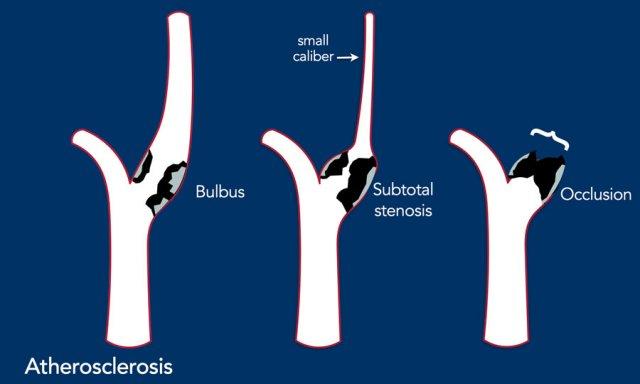 Trong hẹp xơ vữa mức độ cao, dòng chảy qua động mạch cảnh trong bị giảm nặng nề, dẫn đến xẹp lòng mạch và hậu quả là khẩu kính mạch máu phía xa vị trí tắc nghẽn bị thu nhỏ lại.
