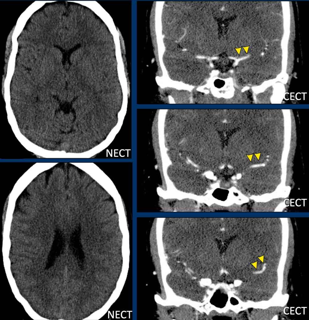 Trên CT có tiêm thuốc cản quang (CECT), các mạch máu nội sọ ngấm thuốc bình thường, nghĩa là không có tắc nghẽn nội sọ.