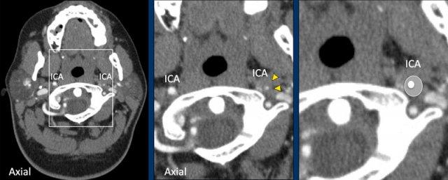 - Trên các lớp cắt ngang (axial), lòng mạch ICA bị hẹp và lệch tâm.