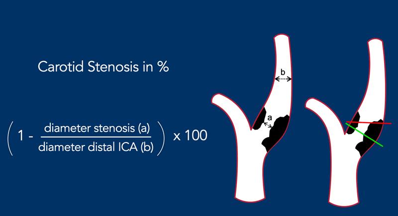 Hình minh họa thể hiện công thức đo mức độ hẹp theo tiêu chuẩn NASCET (Thử nghiệm Cắt bỏ nội mạc động mạch cảnh có triệu chứng Bắc Mỹ).