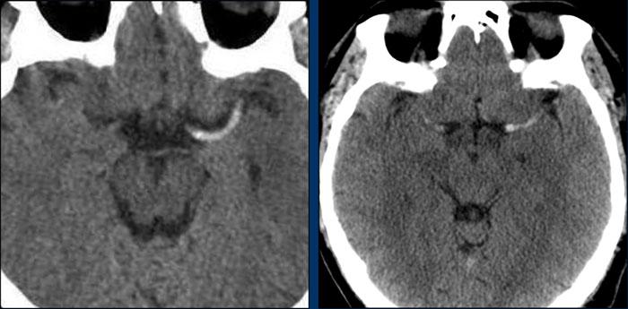 Bất cứ khi nào bạn thấy những huyết khối tăng tỷ trọng đặc biệt cao như thế này, hãy nghĩ đến bóc tách mạch máu và cuộn xuống quan sát ngay phía dưới nền sọ.