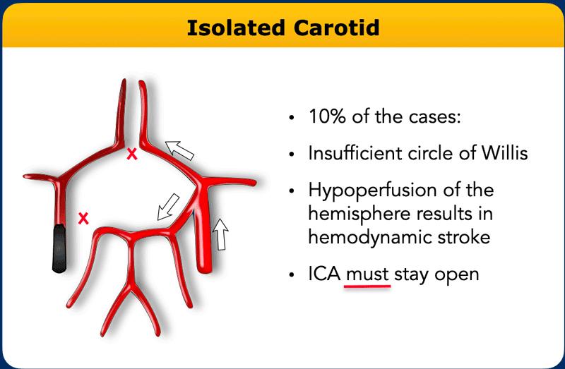 Động mạch cảnh bị cô lập có nghĩa là động mạch cảnh trong (ICA) cung cấp máu cho động mạch não trước và động mạch não giữa cùng bên, nhưng không có kết nối với bên đối diện hoặc tuần hoàn sau, do động mạch thông trước (Acom) và động mạch thông sau (Pcom) vắng mặt như một biến thể giải phẫu.