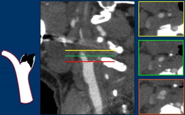 Trên mặt phẳng cắt đứng dọc của CTA, có thể thấy hình ảnh nhô ra dạng vách ngăn ở thành lưng của bầu động mạch cảnh trong (ICA).