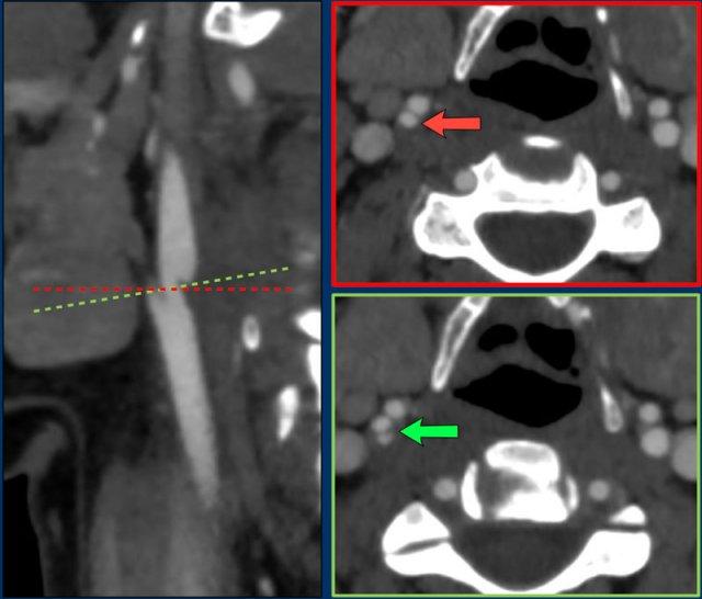 Tuy nhiên, để chẩn đoán xác định màng nhện động mạch cảnh, cần phải quan sát thấy một gờ nối thành bên và thành trong của động mạch cảnh trong trên mặt phẳng cắt ngang (mũi tên ảnh bên phải).