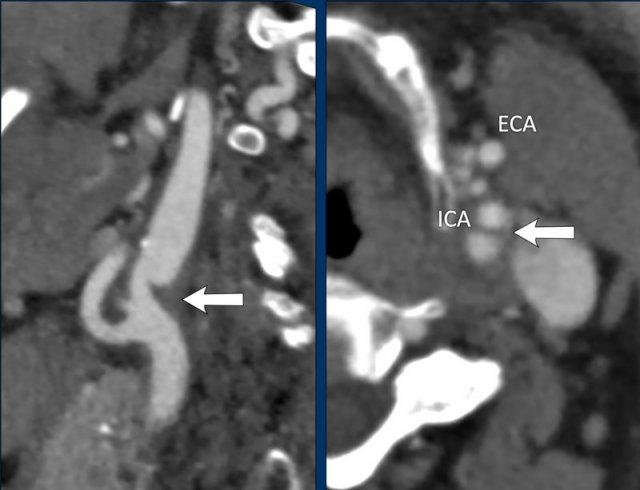 Lưu ý rằng trên tái tạo CTA, bạn có thể theo dõi đường viền của ICA bị giãn phía trên mức mà thuốc cản quang dừng lại.