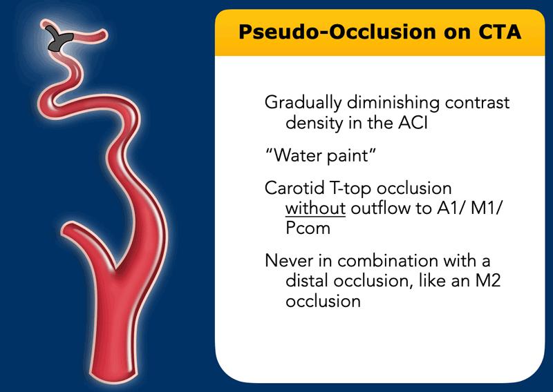 Trong tắc nghẽn giả, hình ảnh trông như thể có tắc hoàn toàn tại ICA ngay trên mức xoang cảnh.