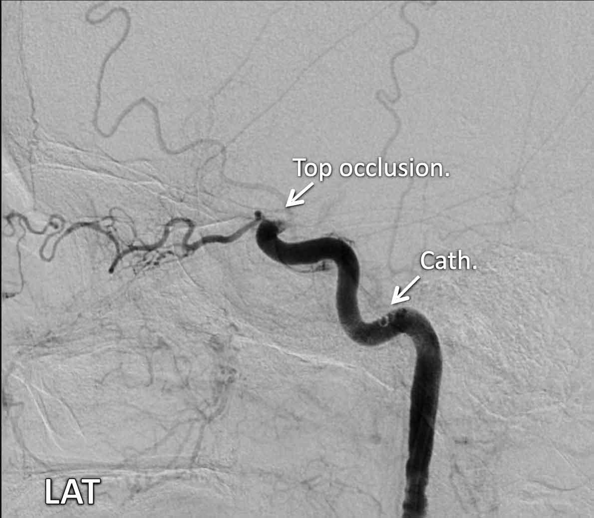 Khối máu tụ thành mạch phần lớn đã được tiêu huyết khối thông qua điều trị tĩnh mạch bằng chất hoạt hóa plasminogen mô tái tổ hợp (rt-PA, alteplase) trước khi can thiệp nội mạch. Vạt nội mạc (intima flap) vẫn còn nhìn thấy. Một lần nữa, bạn có thể thấy vạt nội mạc dừng lại tại mức nền sọ.