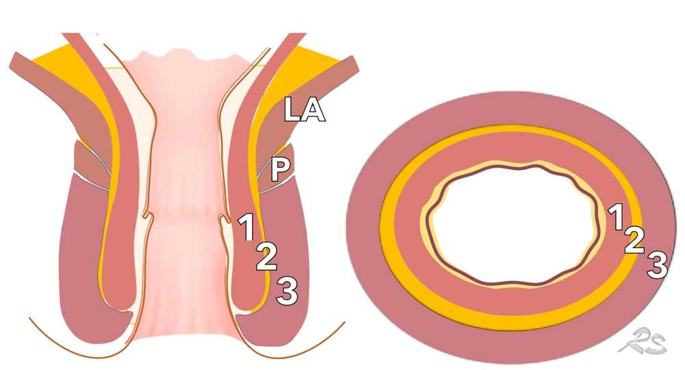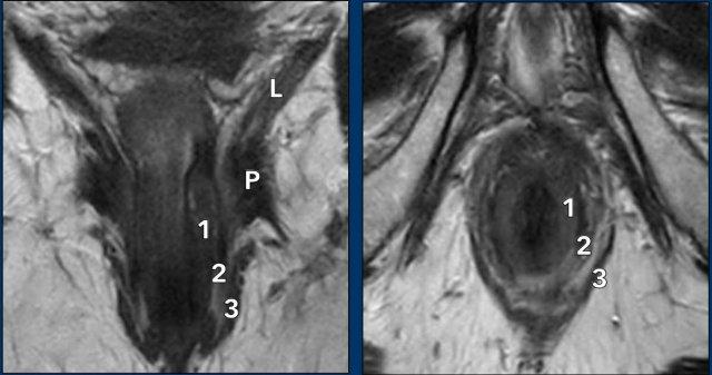 - Các lớp cơ vân của cơ thắt ngoài (3), cơ mu-trực tràng (P) và cơ nâng hậu môn (LA) có tín hiệu thấp.