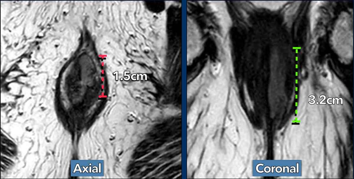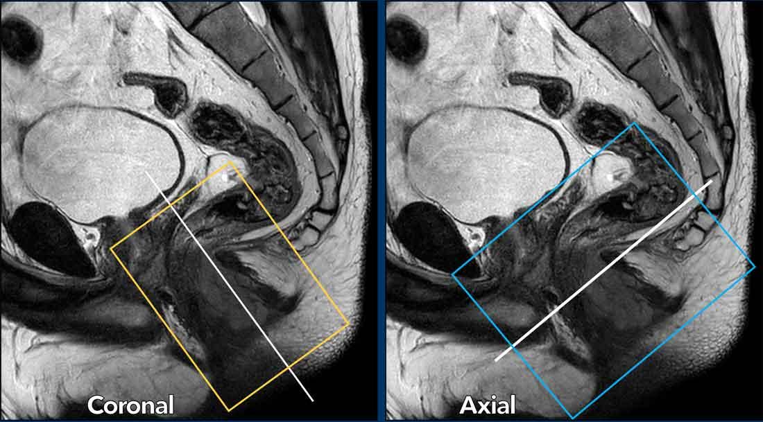 Chuỗi xung T2W độ phân giải cao mặt phẳng coronal được lập kế hoạch song song với ống hậu môn nhằm tối ưu hóa khả năng hiển thị các lớp khác nhau của ống hậu môn.