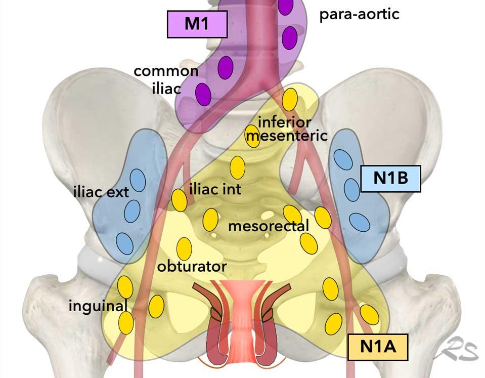 - Hạch M1 là các hạch dọc theo mạch chậu chung và động mạch chủ (màu tím). Chúng được coi là hạch ngoài vùng và thường liên quan đến bệnh không thể chữa khỏi, được điều trị bằng hóa trị liệu姑息.