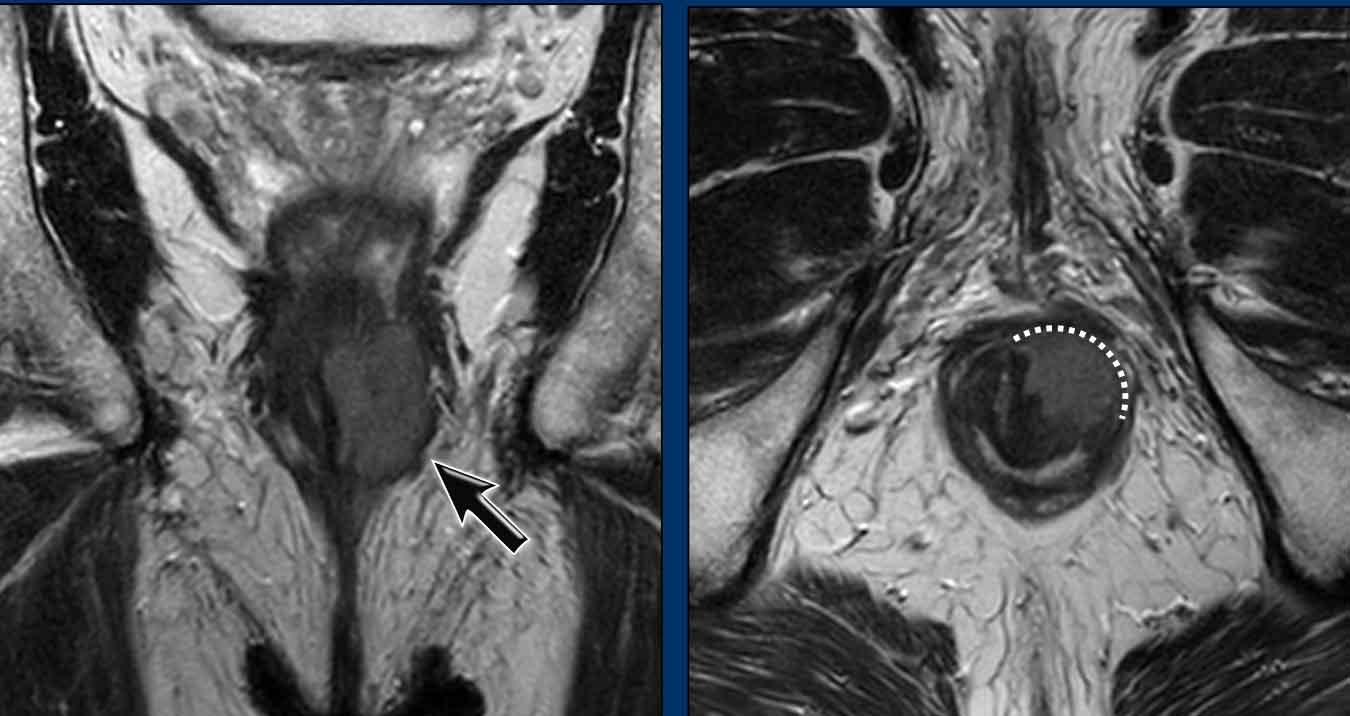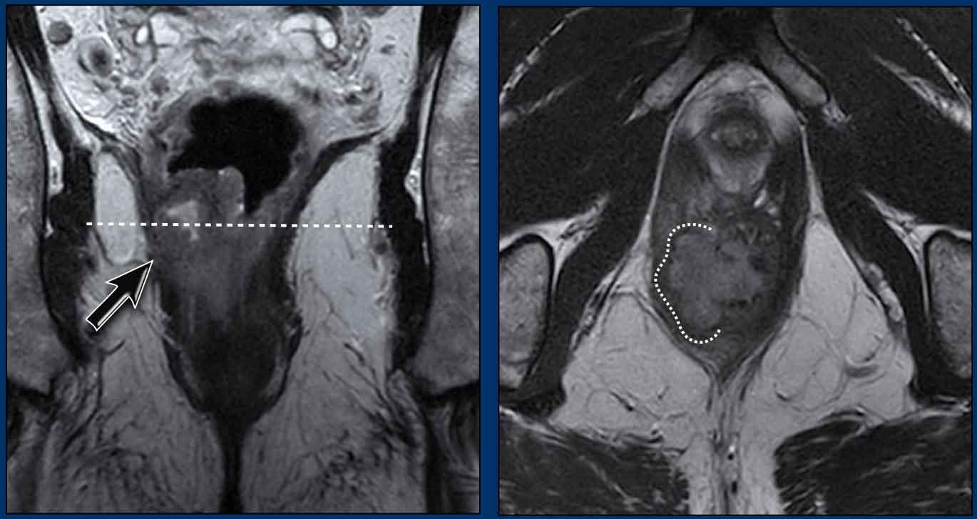 Khối u xâm lấn cơ mu-trực tràng và cơ nâng hậu môn bên phải (mũi tên) và lan rộng vừa qua mức chỗ nối hậu môn-trực tràng (đường chấm) vào đoạn xa trực tràng.