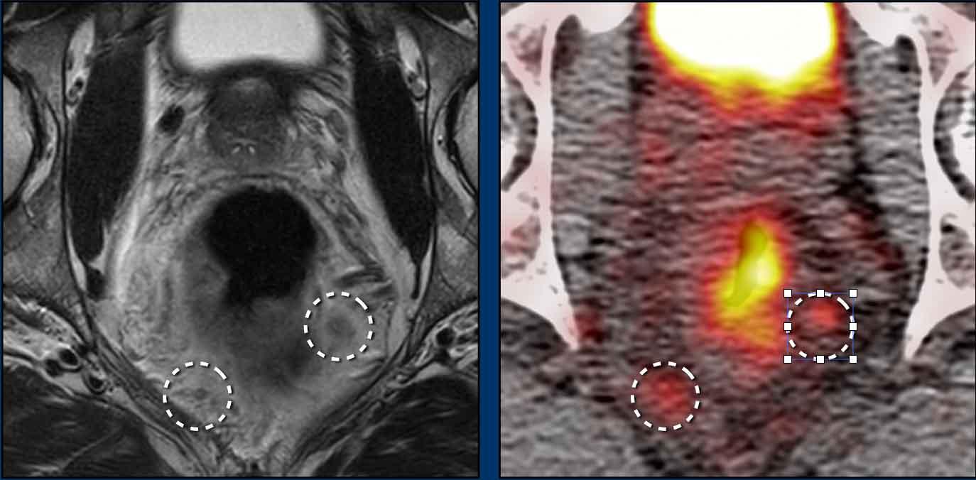 Trong trường hợp này có hai hạch bạch huyết nhỏ trong mạc treo trực tràng được đánh giá là không rõ ràng trên MRI.
