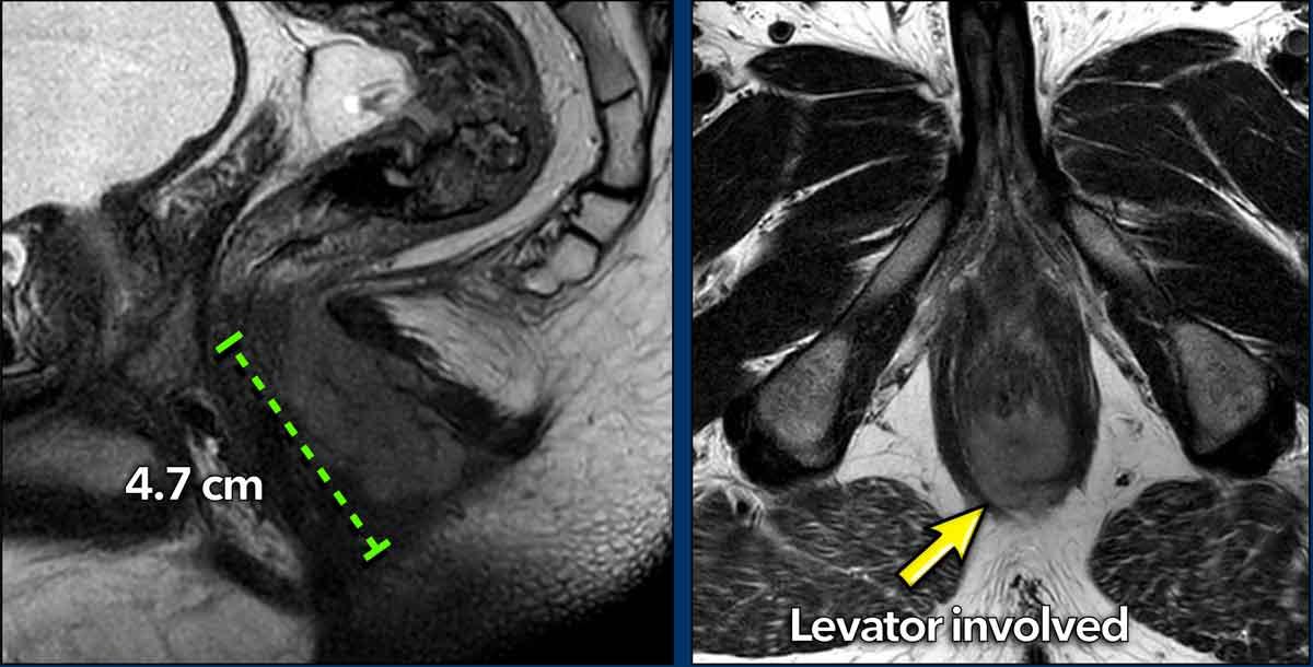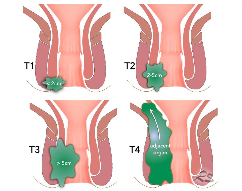 Trong trường hợp ung thư hậu môn, tổn thương này được phân giai đoạn T2 (đường kính 2-5 cm), trong khi nếu là ung thư trực tràng, sự xâm lấn cơ thắt ngoài và cơ nâng hậu môn sẽ cấu thành giai đoạn T4.