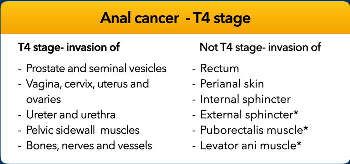 Khác với ung thư trực tràng, xâm lấn cơ thắt ngoài (*) và các cơ sàn chậu (*) không được xếp vào giai đoạn T4 khi phân giai đoạn ung thư hậu môn.