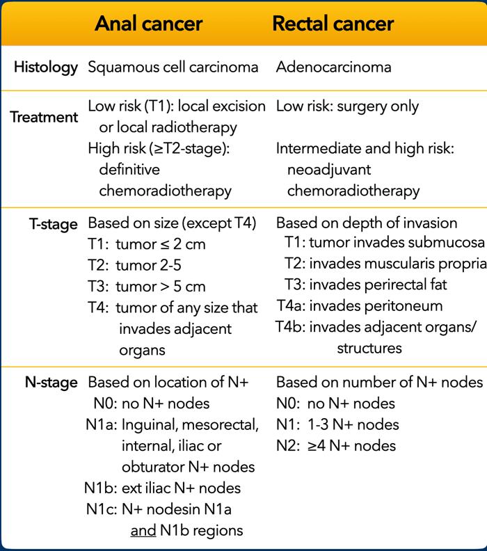 Bảng tóm tắt các điểm khác biệt chính về phân giai đoạn và điều trị giữa ung thư hậu môn và ung thư trực tràng.
