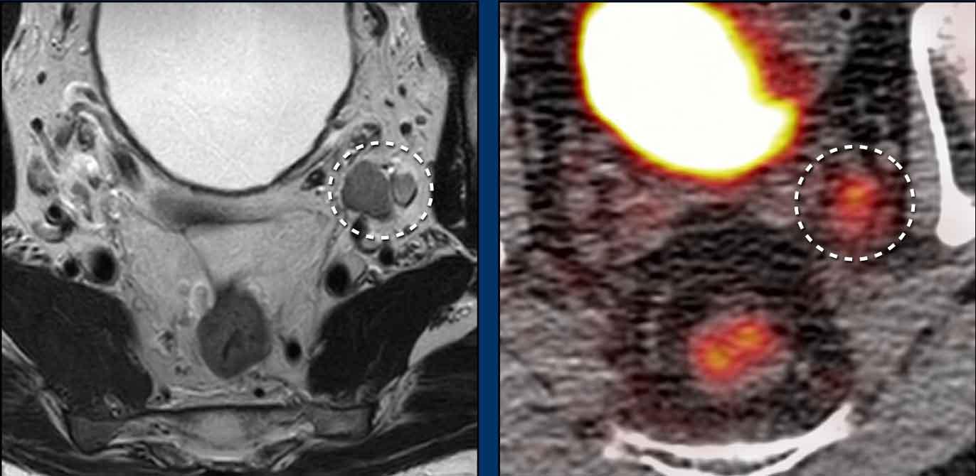 MRI cho thấy một hạch bạch huyết to rõ rệt (đường kính trục ngắn 1,5 cm) liền kề mạch chậu trong, được phân giai đoạn là N+ trên MRI.