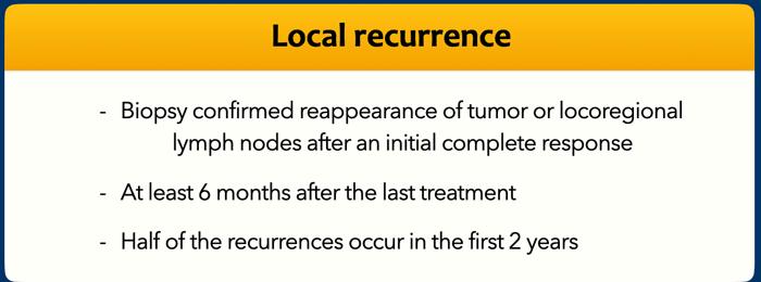 Tái phát tại chỗ được định nghĩa là sự tái xuất hiện của khối u hoặc hạch bạch huyết vùng được xác nhận bằng sinh thiết sau khi đạt đáp ứng hoàn toàn ban đầu, ít nhất 6 tháng sau phân liều xạ trị cuối cùng.