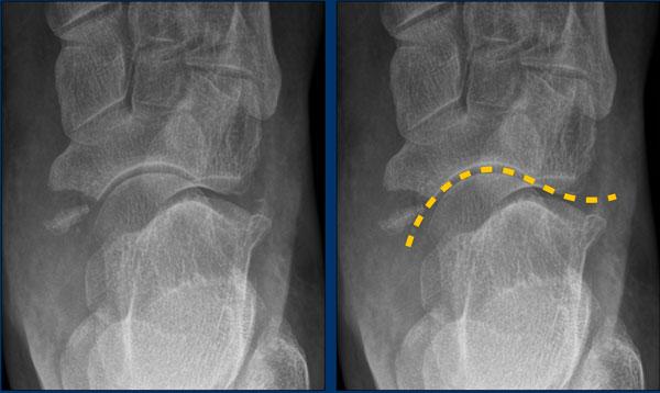 Với liên kết xơ hoặc sụn, các xương nằm gần nhau, cả hai đều có bề mặt không đều, và phần trước trong của xương gót bất thường bị giãn rộng hoặc phẳng dẹt.