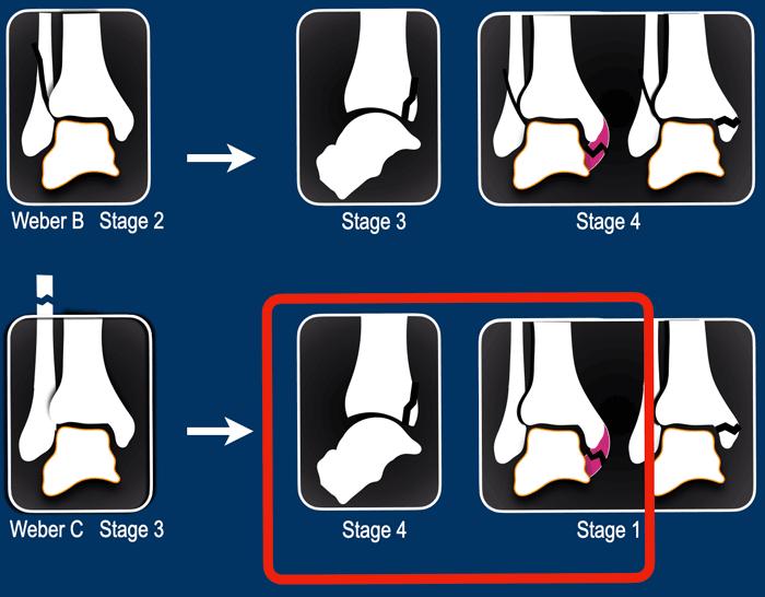 Trong giai đoạn 2 luôn có gãy xương thẳng đứng của mắt cá trong và phải có hoặc là bong điểm bám của mắt cá ngoài hoặc đứt dây chằng bên vì các trình tự này luôn theo thứ tự này với giai đoạn 1 trước rồi đến giai đoạn 2.