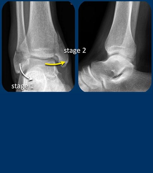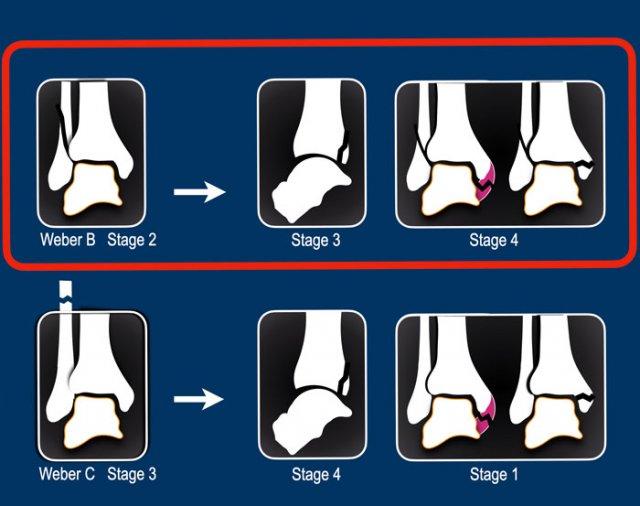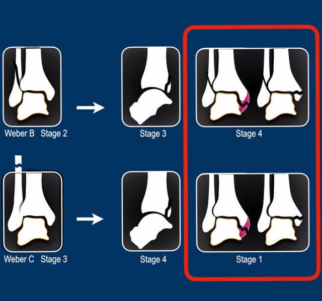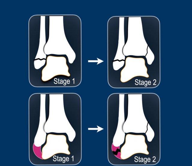 Trong giai đoạn 1, có thể xảy ra đứt dây chằng bên ngoài hoặc gãy xương bong điểm bám (còn được gọi là Weber A).